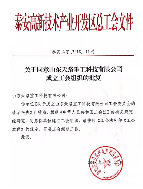 為進一步健全山東天路重工科技有限公司(以下簡稱“天路重工”)內部各項運行機制,更好地組織引導服務職工和維護職工合法權益,經泰安市高新技術產業(yè)開發(fā)區(qū)總工會同意,8月6日,天路重工隆重召開工會成立大會暨**屆工會會員大會,公司全體員工出席會議。