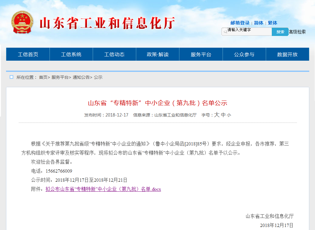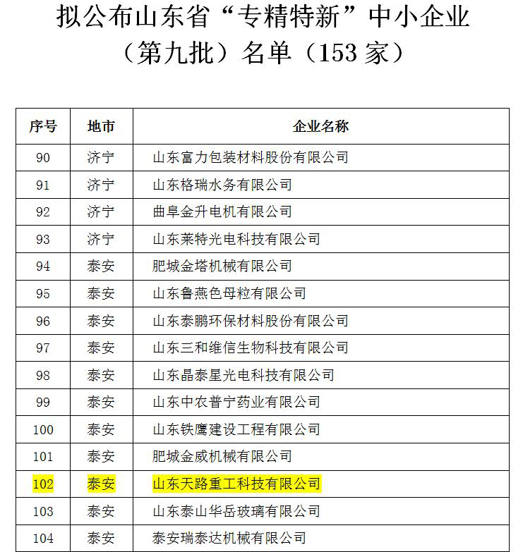 2018年12月21日,在公示期結(jié)束之后,天路重工再次拿下了一項企業(yè)界大獎--山東省“專精特新”中小企業(yè)榮譽稱號!
